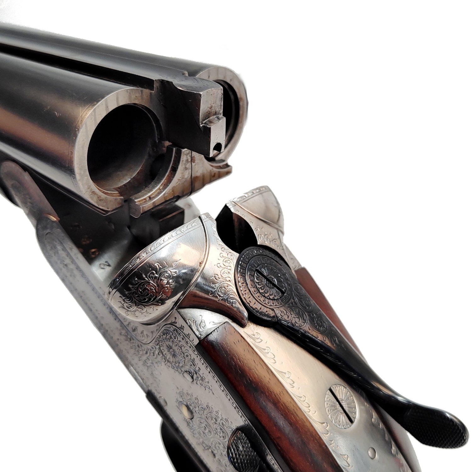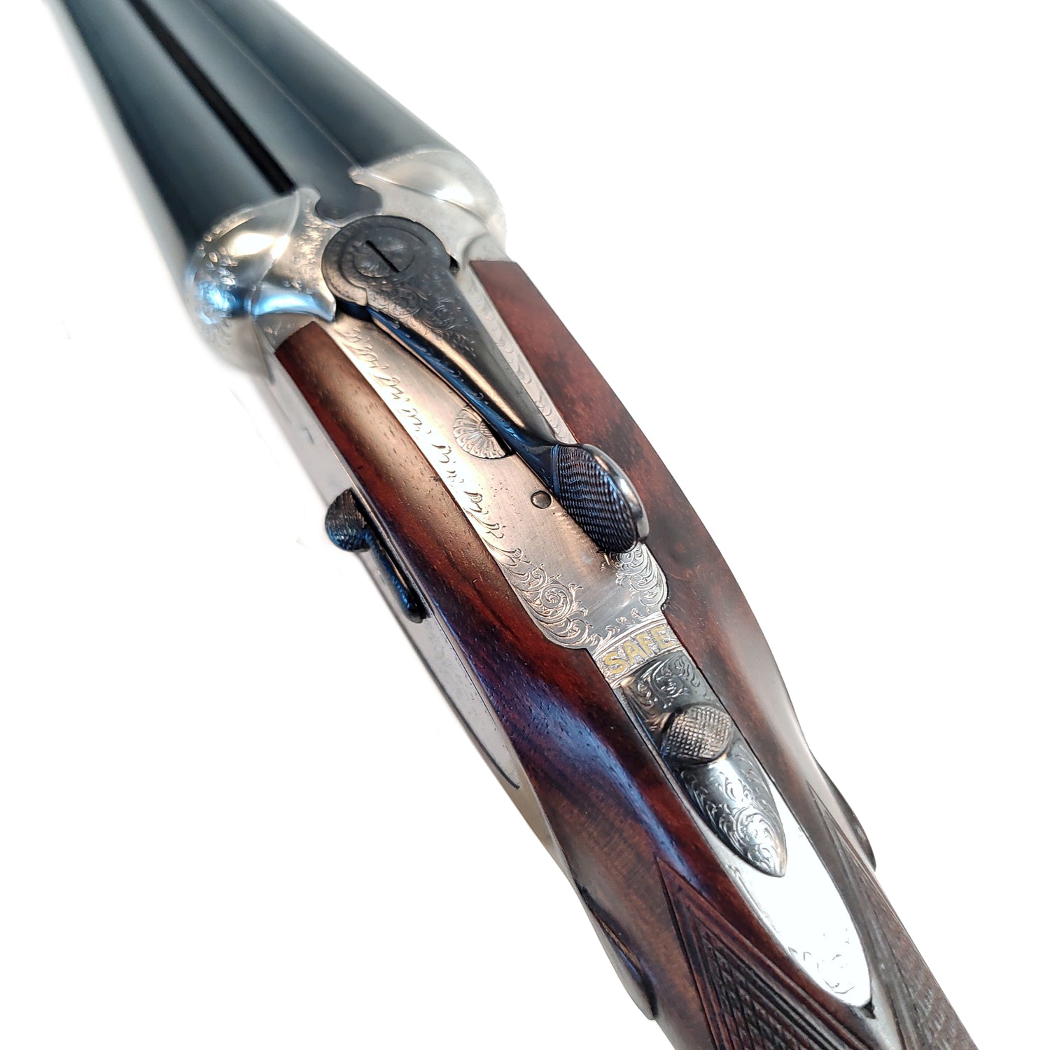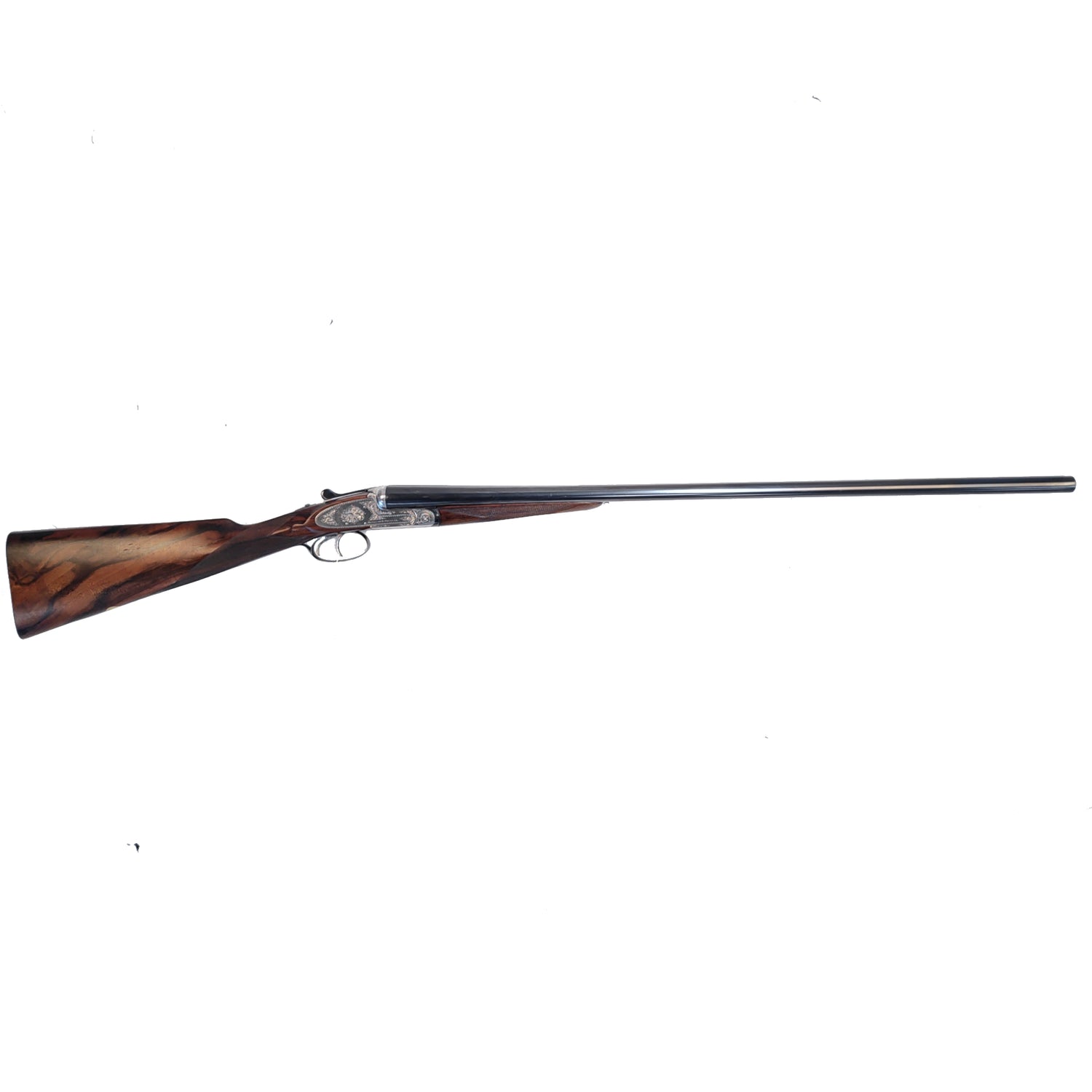 Sjældent udbudt Best Gun i kaliber 16/70. Geværet er i fremragende stand og har flere attraktive egenskaber som 76 cm pibe, trangboring tilpasset stålhagl og lav vægt. Skæftetræet er kontrastfyldt med kraftigt fremtrædende åretegninger og mørkebrun oliefinish. Geværet står smukt med silver coin finish og en klassisk Rose & Scroll-gravering. Aftrækkerbøjle, toplukkernøgle og beslag til afmontering af sidelåse er brunerede.