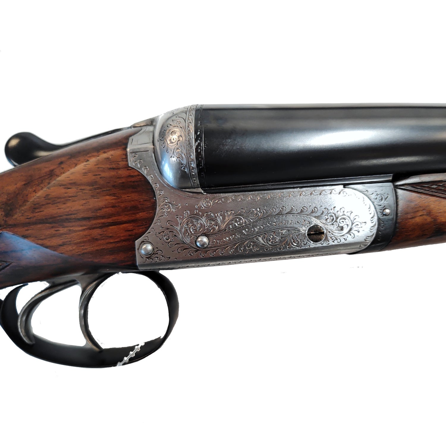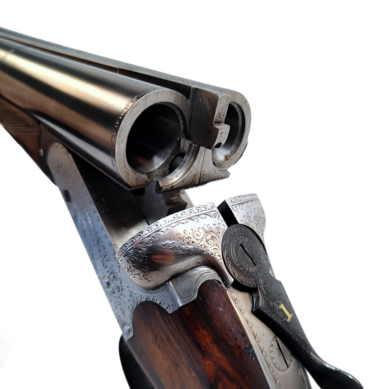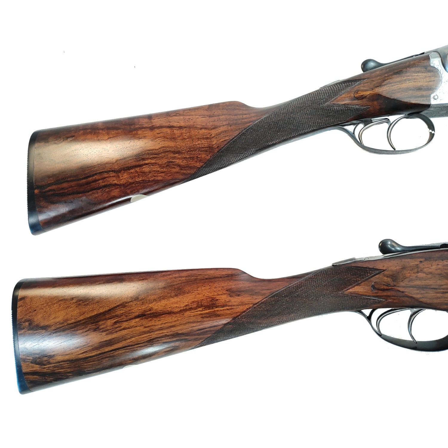 Dette eksklusive sæt af to identiske Army & Navy haglgeværer, bygget af den berømte våbenmager Henry Monk Chester, repræsenterer det ypperste inden for traditionelt britisk håndværk. Disse geværer, selvom de er brugte, fremstår i fremragende stand og kombinerer enestående kvalitet med tidløst design.