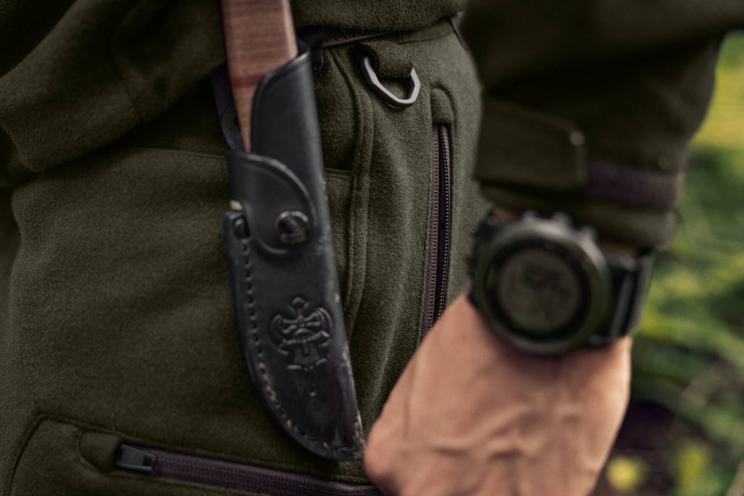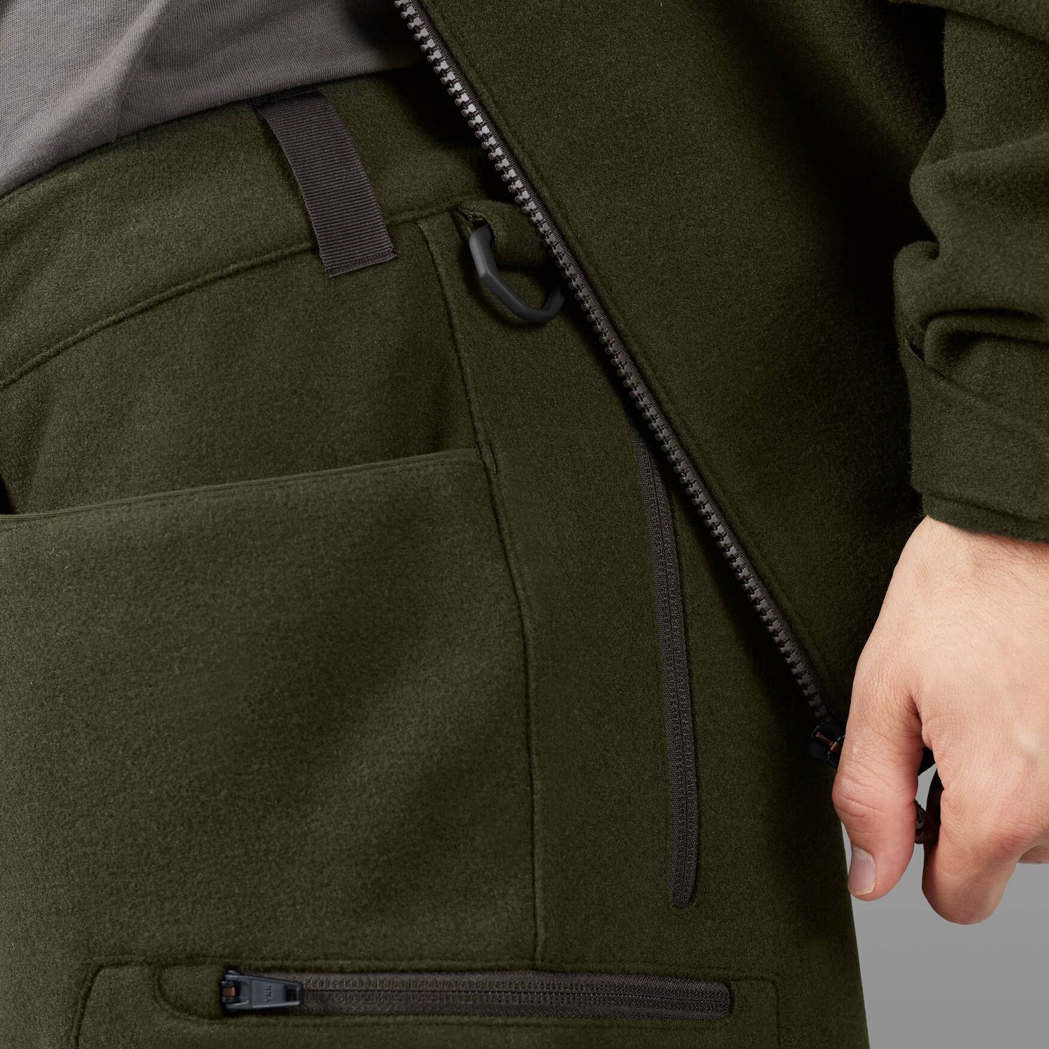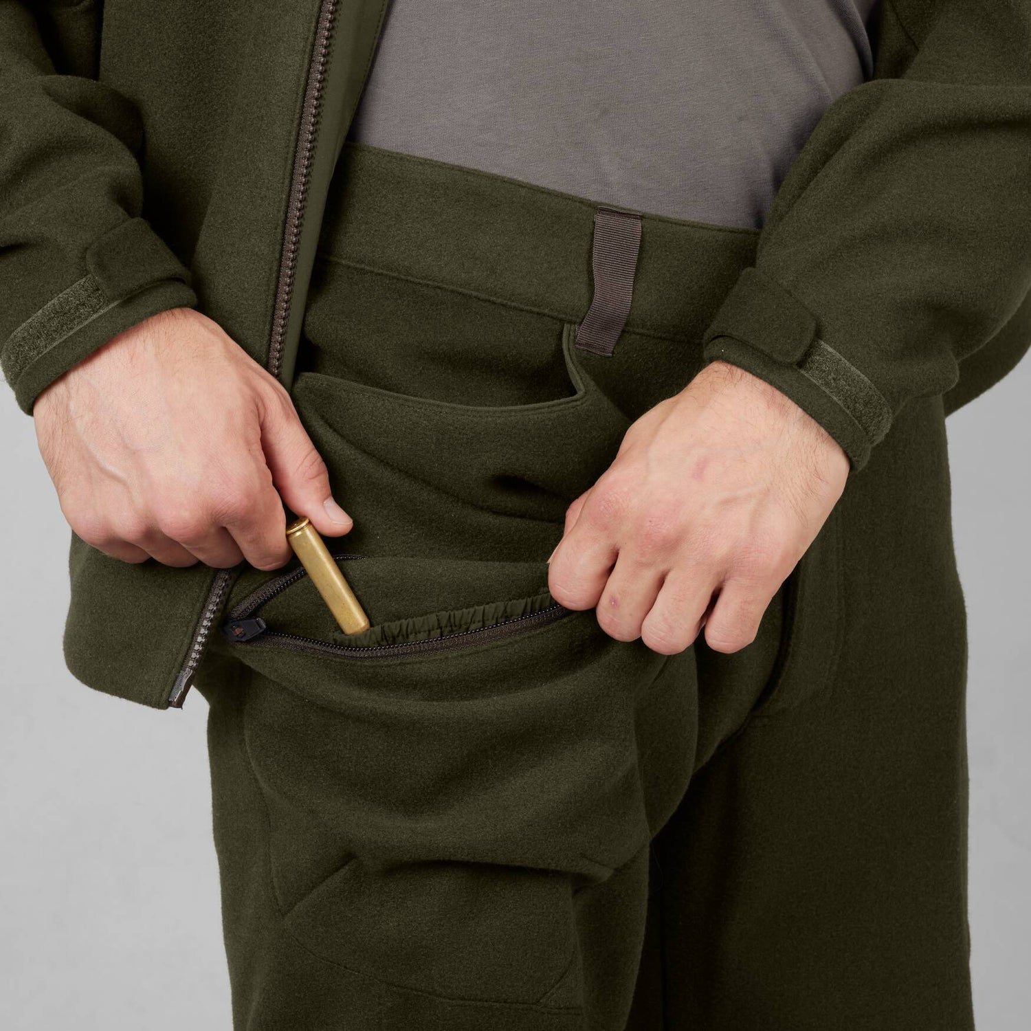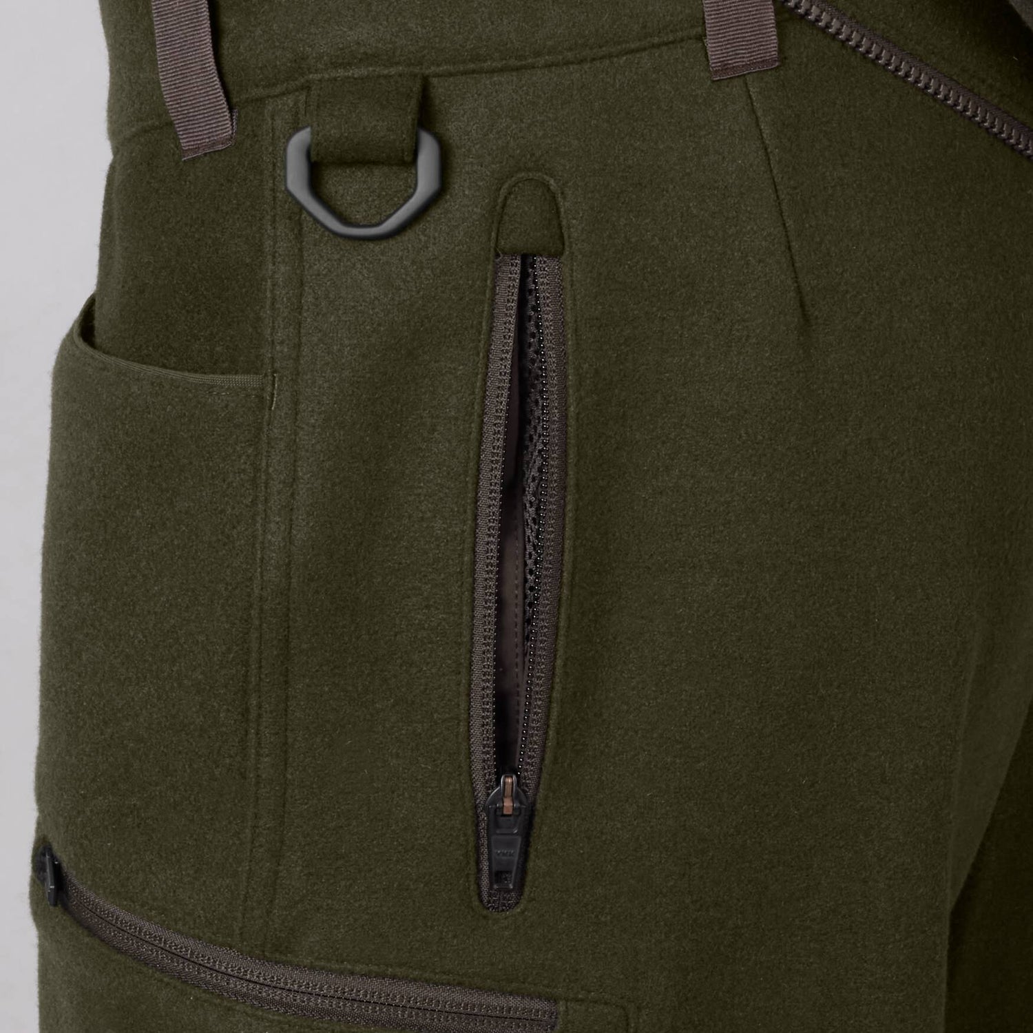I venstre side af hoften er der en kraftig D-ring, som du kan klikke forskelligt udstyr eller en hundesnor på. Ud over de to åbne forlommer har bukserne en lomme med lynlås på hvert overlår til din mobiltelefon eller andet, der ikke må falde ud af lommerne, når du pürscher. I højre lårlomme er der en patronholder til fire patroner, så du har plads til lidt backup-ammunition.
