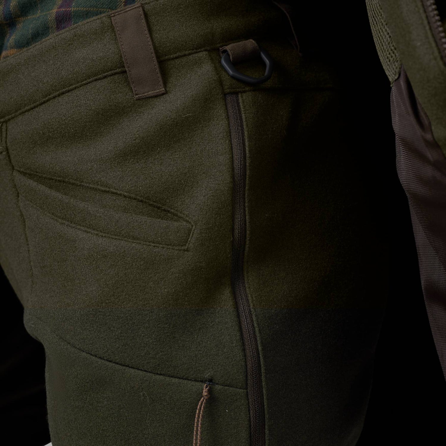 Derudover har bukserne en række praktiske funktioner, som du vil sætte pris på ude på jagten: Ved hofterne er der ventilationslynlåse med netstof indeni, så du kan lufte ud, hvis du får det varmt, uden at der kan trænge insekter, blade eller smågrene ind. I venstre side af hoften er der en kraftig D-ring, som du kan klikke forskelligt udstyr eller en hundesnor på. Ud over de to åbne forlommer har bukserne en lomme med lynlås på hvert lår til din mobiltelefon eller andet, der ikke må falde ud af lommerne, når du pürscher. I højre lårlomme er der en patronholder til fire patroner, så du har plads til lidt backup-ammunition.