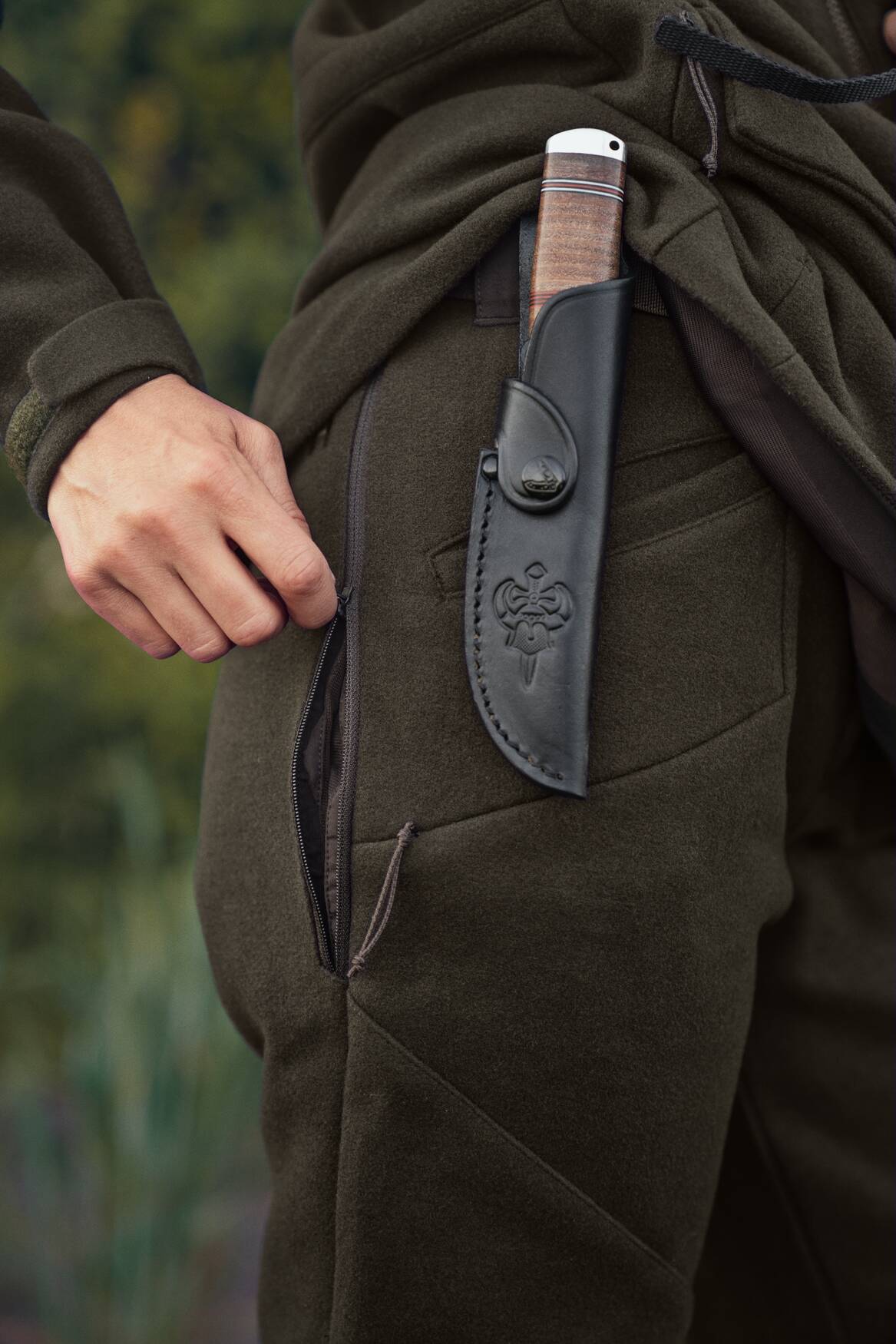 - Lårlommer med skjult lynlås og indvendig patronholder i højre lomme