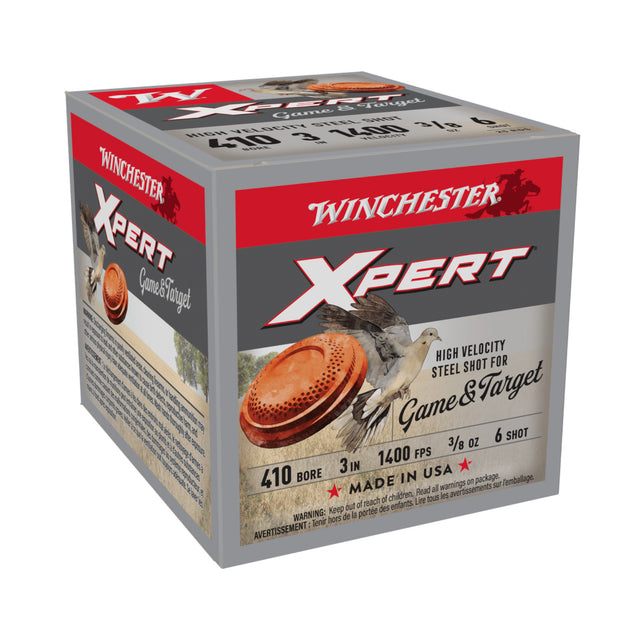 Winchester Xpert Game & Target i .410 Gauge er en 3" stålhaglpatron, der kombinerer let rekyl med høj præcision. Med 11 gram hagl i str. 6 er den velegnet til jagt på de mindste vildtarter og træning med våben i kal 410.