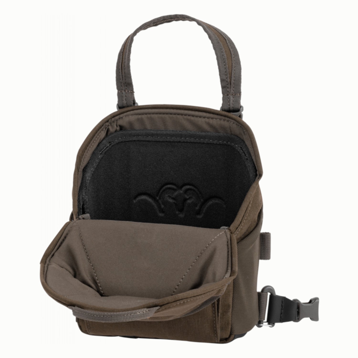 Det solide bæresystem fordeler vægten jævnt over skuldre og ryg, hvilket gør den behagelig at bære – også på lange ture. Den centrale hovedlomme har en lydløs magnetlukning, der beskytter din kikkert mod både stød og vejr, mens sidelommerne giver plads til mindre tilbehør. På undersiden finder du Molle-stropper, så du kan montere ekstra lommer, f.eks. til bipod eller ammunition.