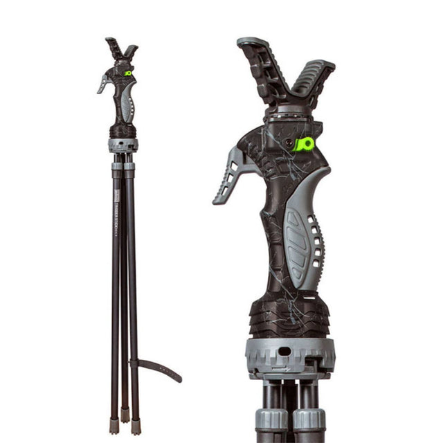 Den trebenede konstruktion sikrer maksimal stabilitet, også på ujævnt terræn. Stokken kan anvendes både stående, knælende og siddende og tilpasses lynhurtigt til underlaget. Quick Detach-systemet gør det nemt at skifte mellem riffel og optik eller kamera, hvilket øger produktets anvendelighed markant. Med gummibelagt greb og justerbare benvinkler får du kontrol og komfort – selv i krævende situationer.