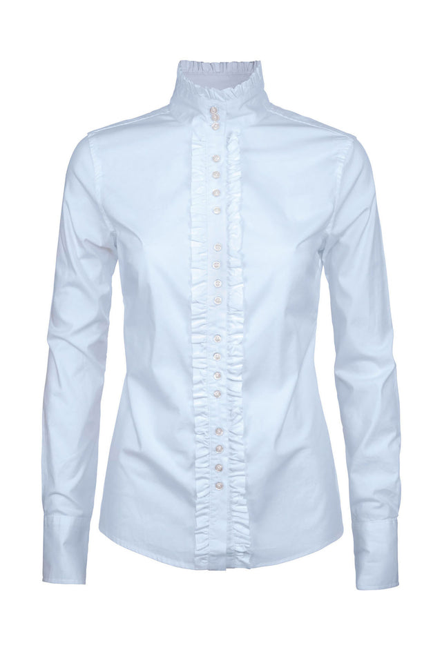 De elegante manchetter med ekstra knapdetaljer fremhæver skjortens eksklusive design, og de fine rynkede kanter langs knapstolpen tilføjer et strejf af romantik til det klassiske snit. Den alsidige hvide farve gør det nemt at kombinere skjorten med forskellige nederdele, bukser eller under en blazer for et mere professionelt look.