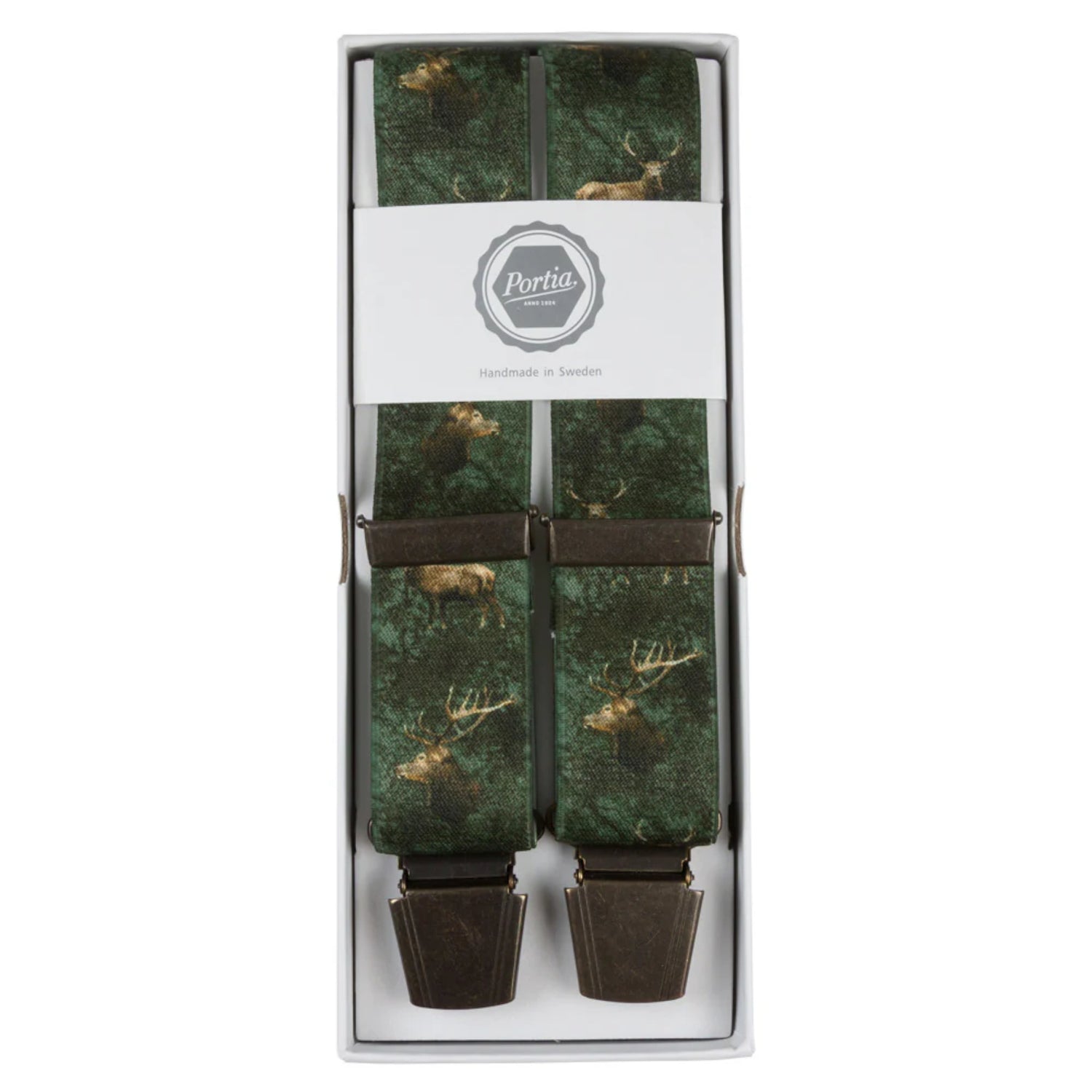 Disse seler fra Portia 1924 er skabt til den kvalitetsbevidste, der værdsætter en klassisk og elegant stil. Selerne er fremstillet i en dybgrøn nuance med hjortemønster, som tilføjer et raffineret udtryk og en jagtlig fornemmelse. Den solide elastik giver en behagelig og fleksibel pasform, der sikrer komfort hele dagen. Med deres gennemførte håndværk og tidløse design fungerer de som en stilfuld tilføjelse til både formelle og afslappede outfits.