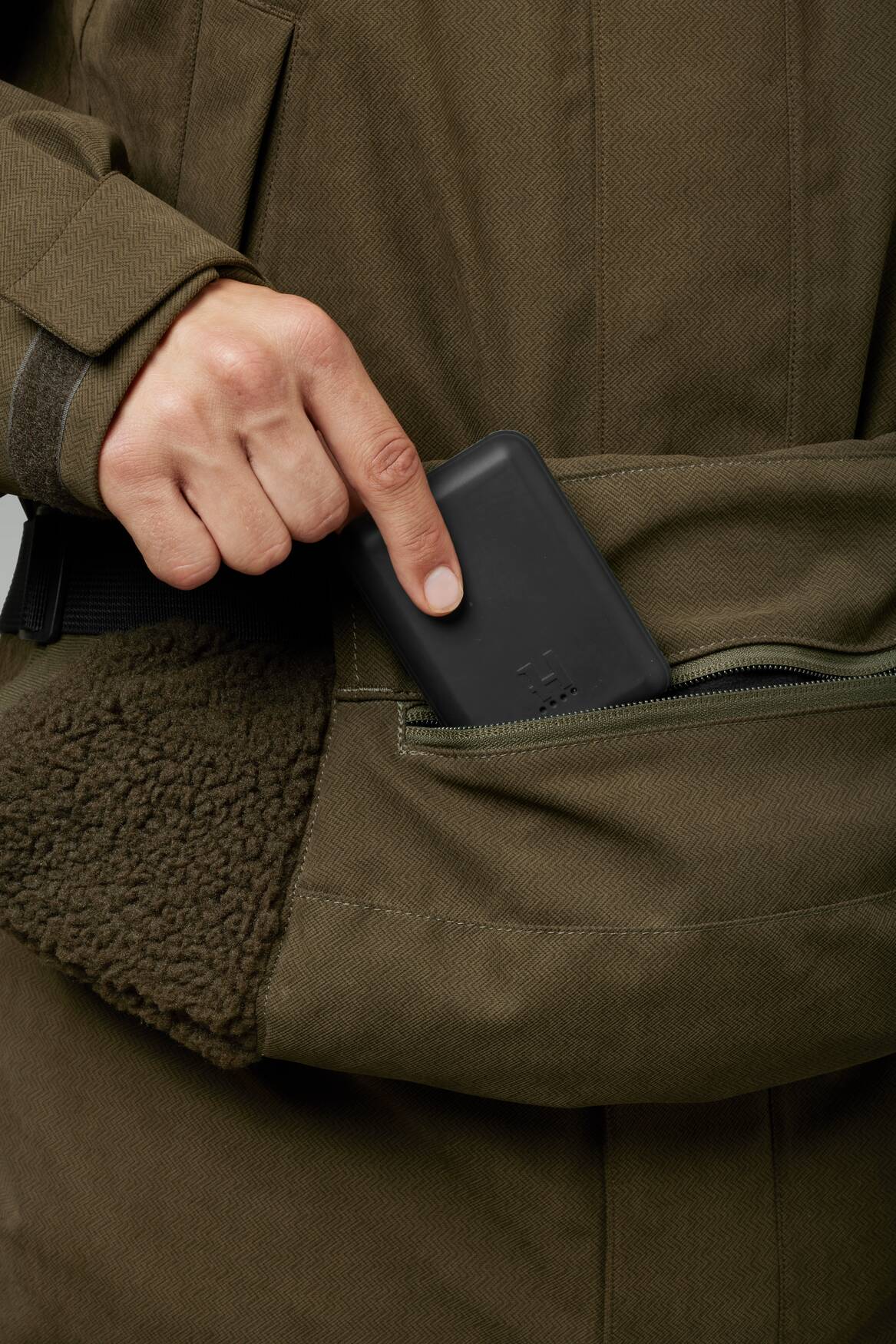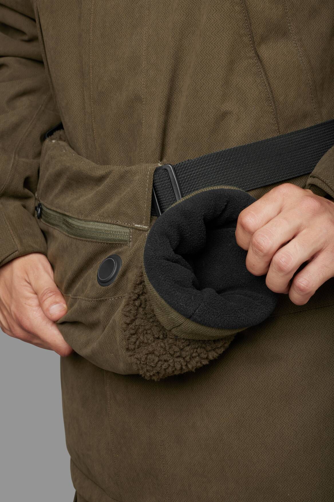 Driven Hunt HEAT-muffen er en foret, varm muffe med Härkilas HEAT-teknologi, så man kan indstille varmen indeni til den ønskede temperatur. Med det medfølgende, aftagelige bælte kan man let klikke muffen omkring livet og altid have den ved hånden, selvom man bevæger sig rundt.