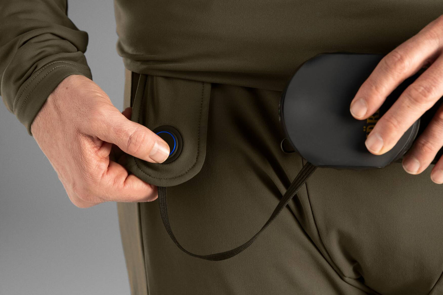 I linningen er der en stofledning med et vandtæt USB-stik, så man kan tilslutte en powerbank efter eget ønske og styrke. Stofledningen er lang nok til, at man kan have powerbanken i sin bukselomme eller lignende, så den ikke er i vejen. Med en powerbank på 10.000mAh kan Härkila Heat Long Johns yde den højeste temperatur på 50C i ca. 7 timer ved en udendørstemperatur på 0C. For at spare på strømmen går varmemembranerne automatisk i dvale, når de lange underbukser har opnået den ønskede temperatur. Derefter slår membranerne af sig selv til igen, hvis temperaturen falder 1-2 grader under det ønskede niveau, uden at man mærker det. Härkila Heat Long Johns er på den måde varmeregulerende, så varmefunktionen automatisk slår fra, hvis man fx får varmen under høj aktivitet, og slår til igen, når man sidder eller står stille.
