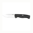 Knivens design er præget af høj brugervenlighed. Det ergonomiske skæfte i sort polymer ligger godt i hånden og giver et fast greb, selv under fugtige forhold. Den integrerede tommelfingerknop gør det nemt at åbne bladet med én hånd, mens den sikre låsemekanisme holder bladet fast i åben position under brug.
