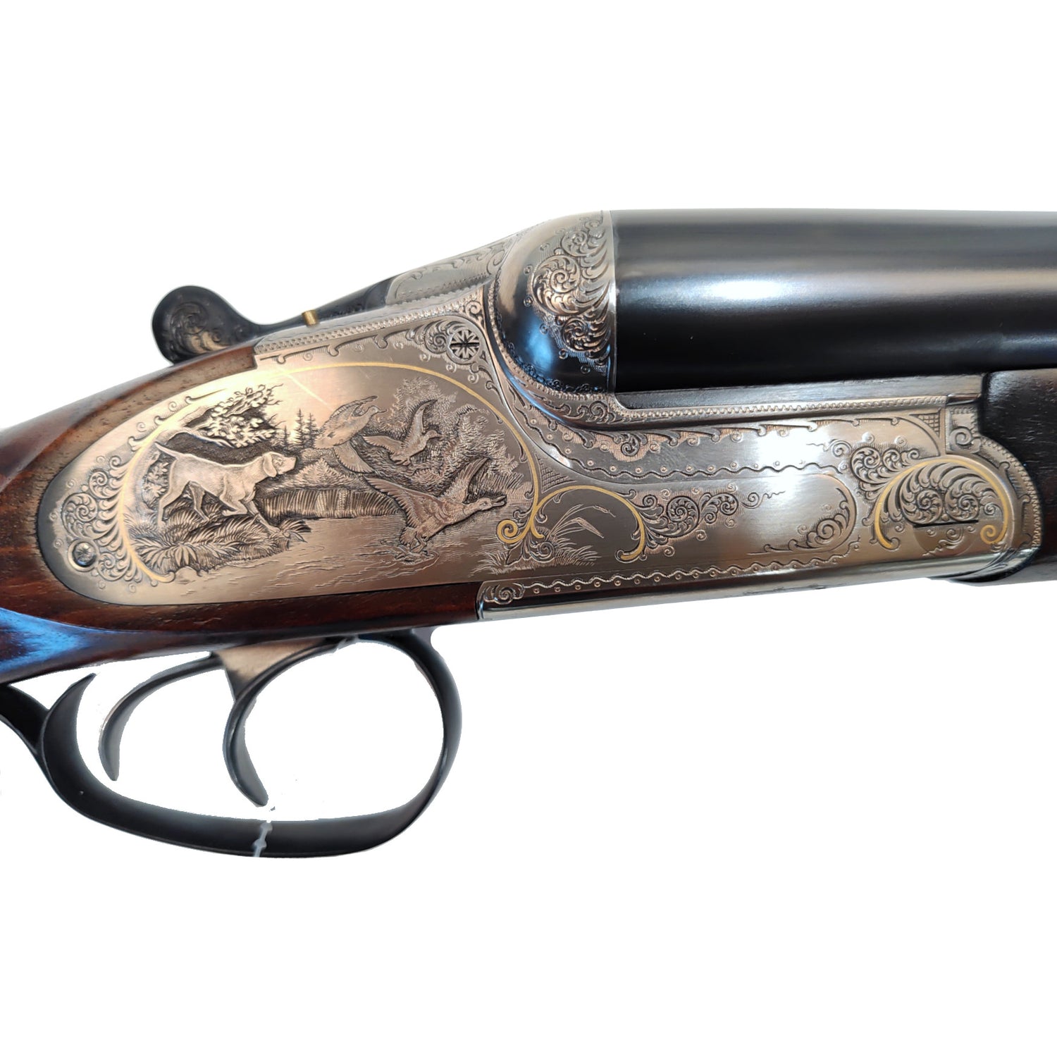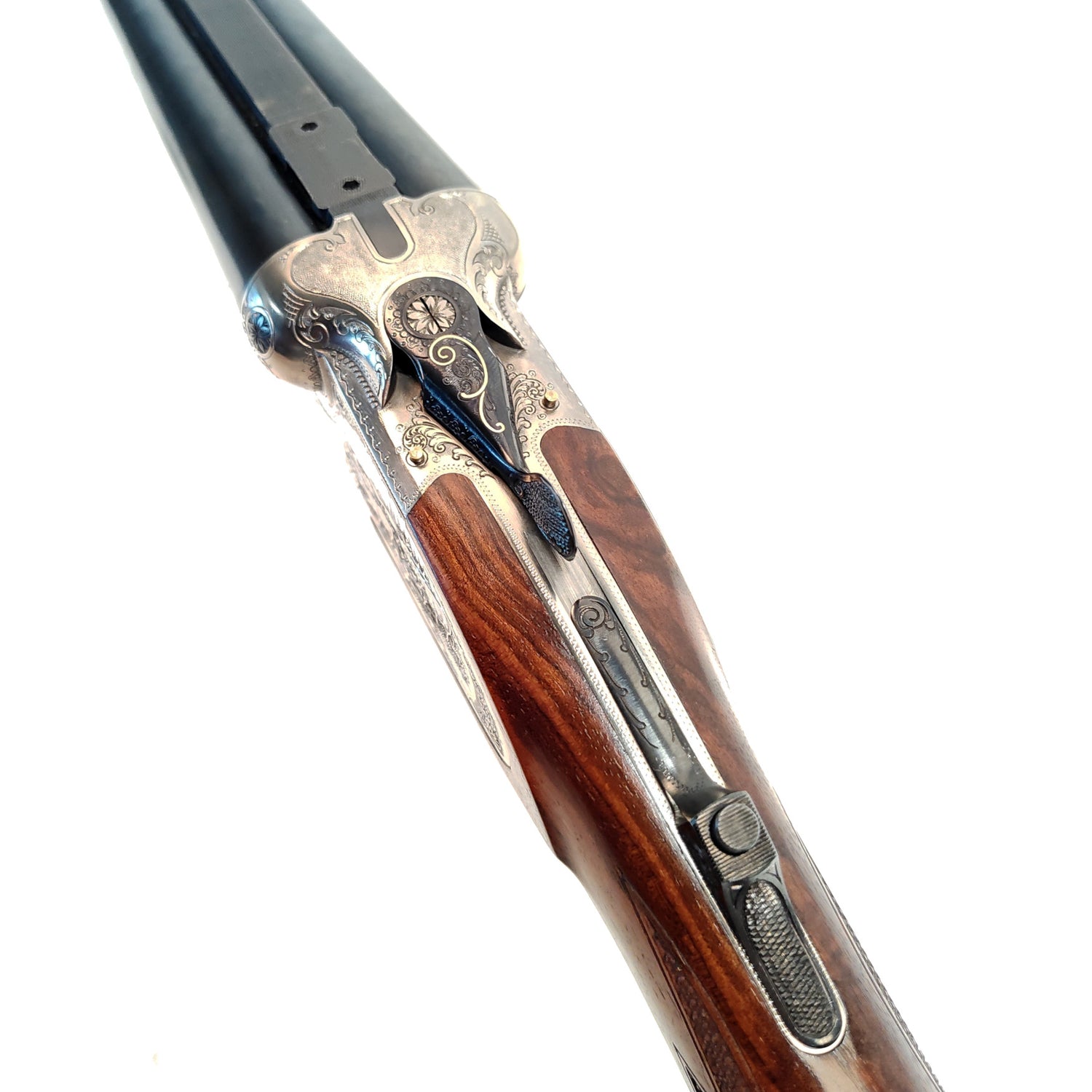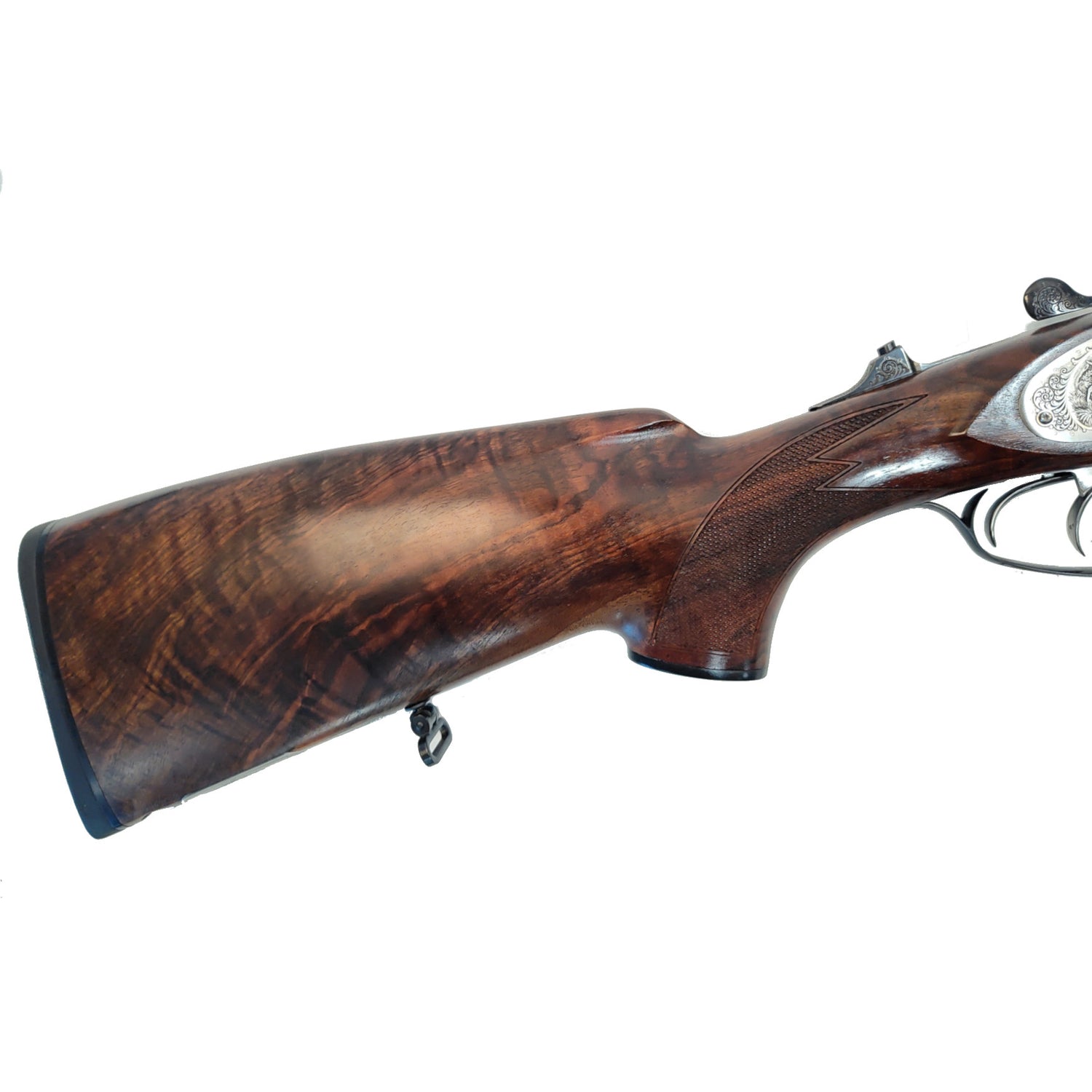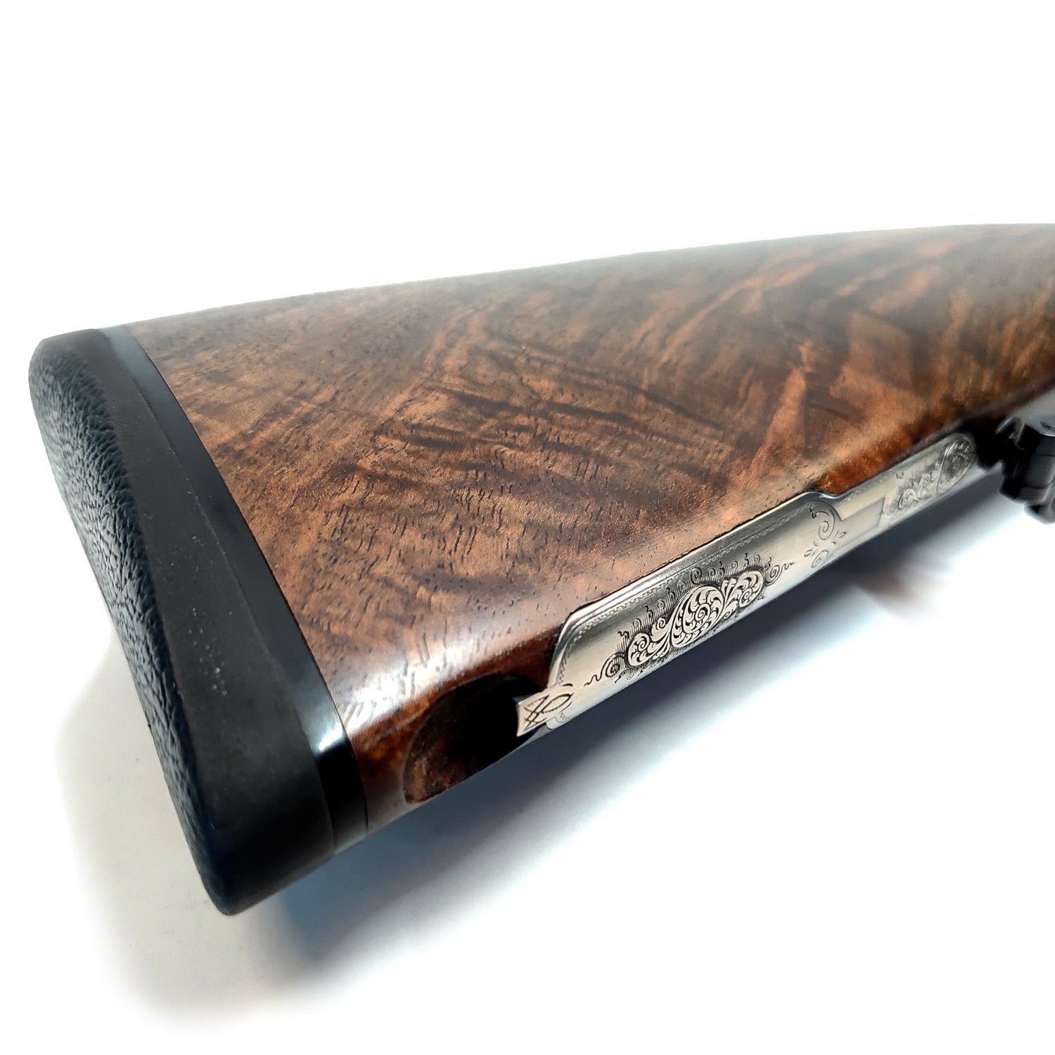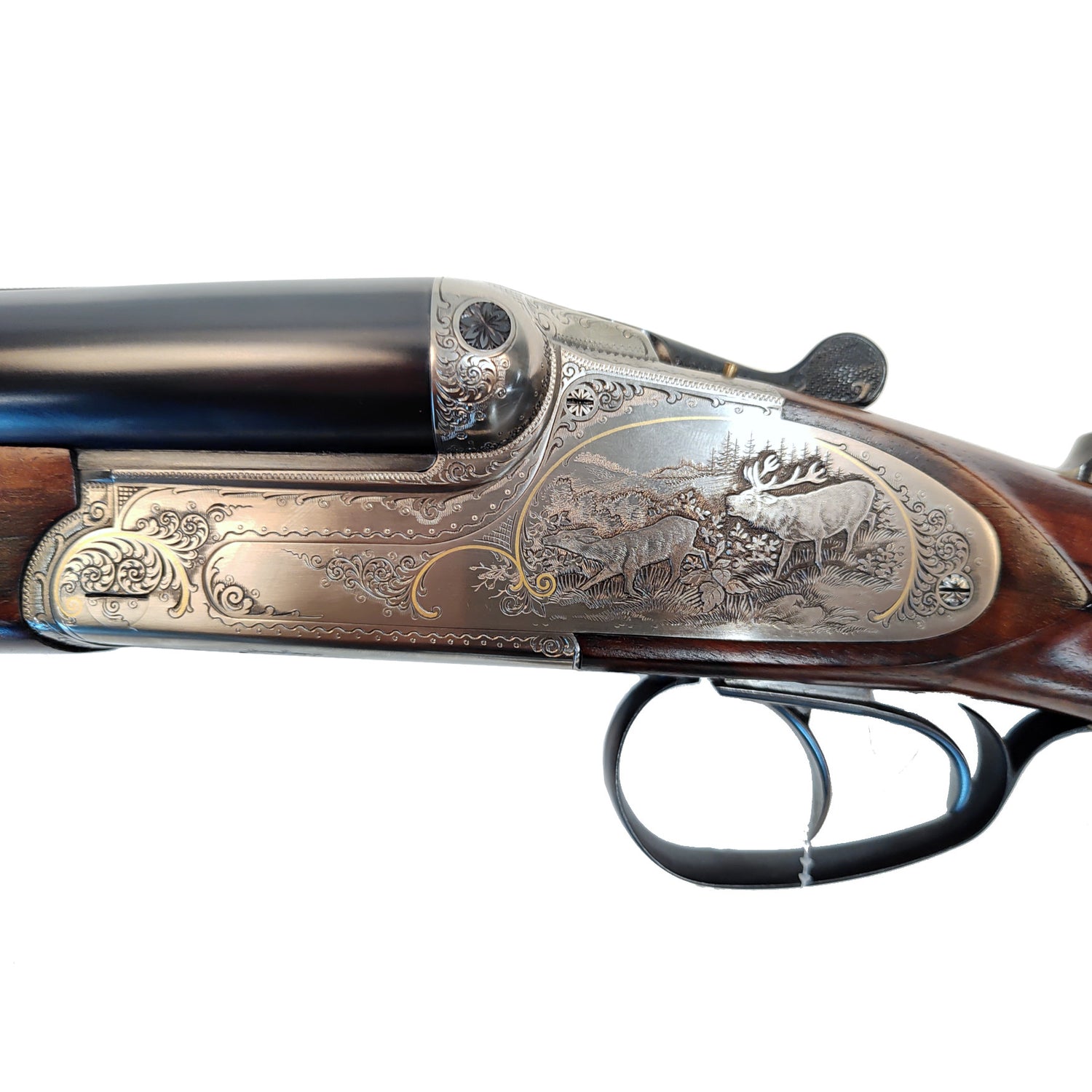Helt utrolig fin drilling med unik detaljerigdom og de helt rigtige specifikationer. Denne Merkel 96KS med sideplader er rigt graveret med vildtmotiver, klassiske tyske arabesque-mønstre og diskrete indlæg i guld. Dertil er der installeret kolbemagasin med plads til tre riffelpatroner.