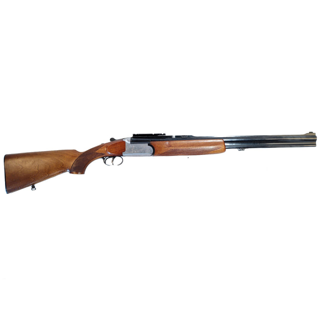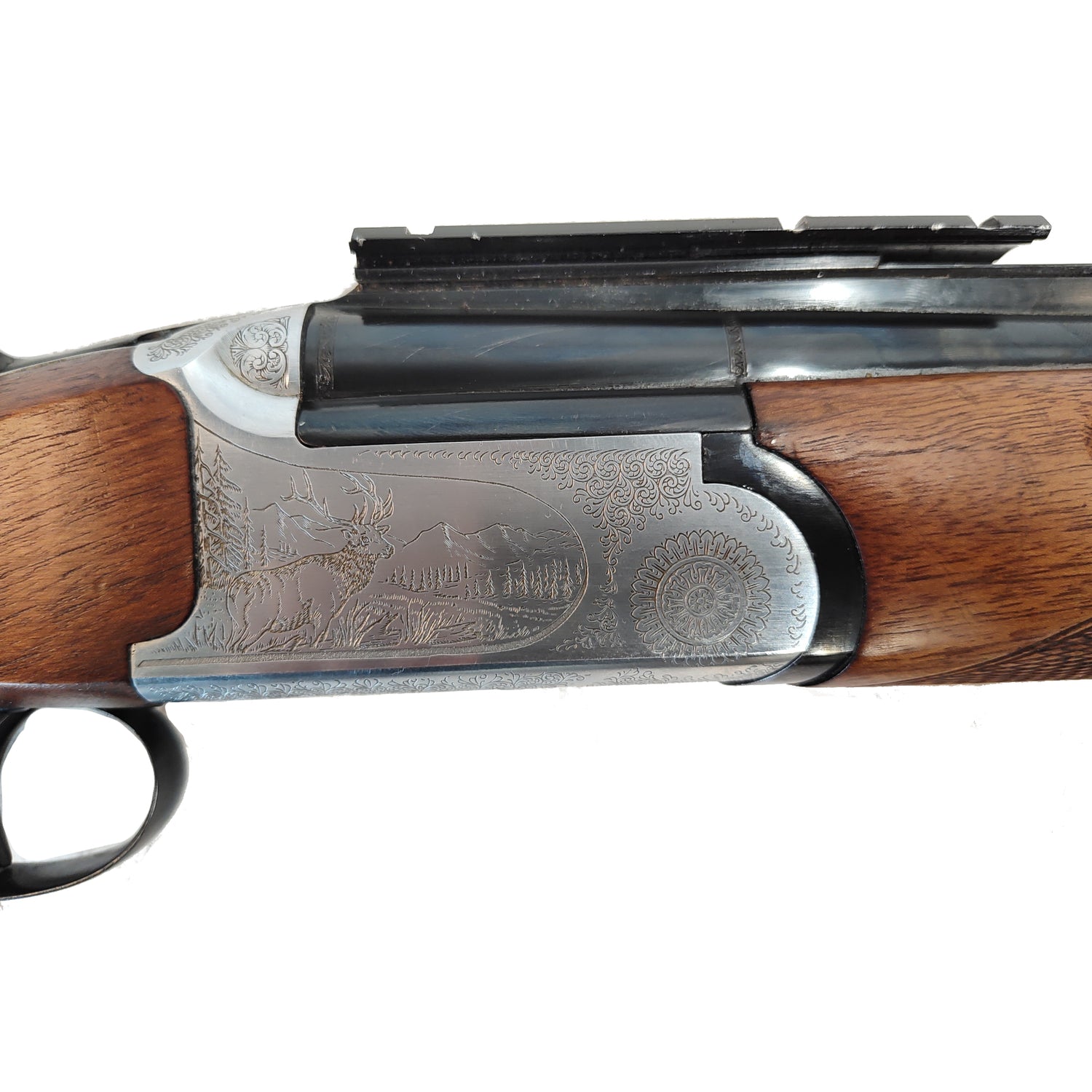 Alsidigt kombinationsvåben fra italienske Sabatti i pæn stand. Med graveret baskule som giver et klassisk udtryk. Sjældent udbudt med riffelkaliber 6,5x55. Monteret med skinne til brug af rødpunktssigte eller anden optik.