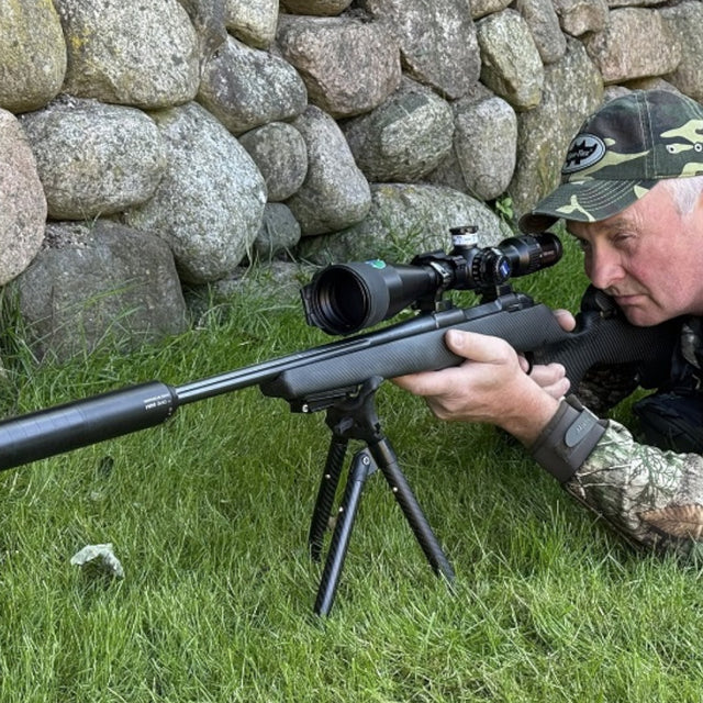 Tripoden består af tre teleskopiske kulfiberrør med gummifødder, som giver godt greb på både hårdt og blødt underlag. Det giver et sikkert anlæg, selv i ujævnt terræn. Fordelen ved denne type skydestøtte er, at du kan læne dig let frem i riflen og opnå øget stabilitet – uden at riflen selv bærer vægten. Den medfølgende tredje støttefod (Single Leg Minor) giver dig fleksibiliteten ved en tripod, samtidig med at vægten holdes helt i bund.